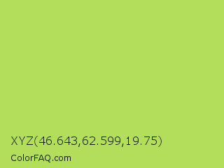 XYZ 46.643,62.599,19.75 Color is a light green color and the nearest color is June Bud #bdda57. Hex code #b3de5c and RGB value is rgb(179,222,92). In RGB color space, this color is composed of 70% red, 87% green, 36% blue, In CMYK color space, this color is composed of 19% cyan, 0% magenta, 59% yellow , 13% black , In HSL color space, this color has a hue angle of 80° , 66% saturation and 62% lightness.