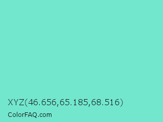 XYZ 46.656,65.185,68.516 Color is a light cyan color and the nearest color is Bermuda #7dd8c6. Hex code #72e7ce and RGB value is rgb(114,231,206). In RGB color space, this color is composed of 45% red, 91% green, 81% blue, In CMYK color space, this color is composed of 51% cyan, 0% magenta, 11% yellow , 9% black , In HSL color space, this color has a hue angle of 167° , 71% saturation and 68% lightness.