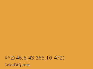 XYZ 46.6,43.365,10.472 Color is a normal orange color and the nearest color is Tulip Tree #eab33b. Hex code #e6a33e and RGB value is rgb(230,163,62). In RGB color space, this color is composed of 90% red, 64% green, 24% blue, In CMYK color space, this color is composed of 0% cyan, 29% magenta, 73% yellow , 10% black , In HSL color space, this color has a hue angle of 36° , 77% saturation and 57% lightness.