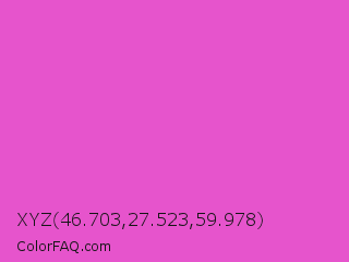XYZ 46.703,27.523,59.978 Color is a light magenta color and the nearest color is Light Deep Pink #ff5ccd. Hex code #e654cc and RGB value is rgb(230,84,204). In RGB color space, this color is composed of 90% red, 33% green, 80% blue, In CMYK color space, this color is composed of 0% cyan, 63% magenta, 11% yellow , 10% black , In HSL color space, this color has a hue angle of 311° , 74% saturation and 62% lightness.
