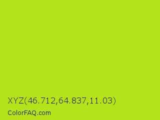 XYZ 46.712,64.837,11.03 Color is a normal lime color and the nearest color is Inch Worm #b0e313. Hex code #b5e31a and RGB value is rgb(181,227,26). In RGB color space, this color is composed of 71% red, 89% green, 10% blue, In CMYK color space, this color is composed of 20% cyan, 0% magenta, 89% yellow , 11% black , In HSL color space, this color has a hue angle of 74° , 79% saturation and 50% lightness.