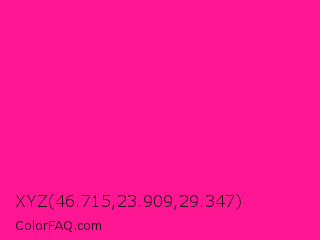 XYZ 46.715,23.909,29.347 Color is a normal rose color and the nearest color is Fluorescent Pink #ff1493. Hex code #ff1692 and RGB value is rgb(255,22,146). In RGB color space, this color is composed of 100% red, 9% green, 57% blue, In CMYK color space, this color is composed of 0% cyan, 91% magenta, 43% yellow , 0% black , In HSL color space, this color has a hue angle of 328° , 100% saturation and 54% lightness.