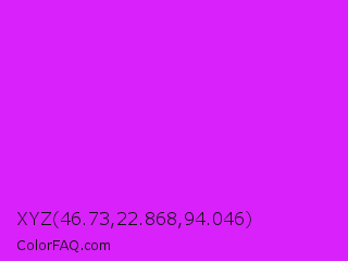 XYZ 46.73,22.868,94.046 Color is a normal purple color and the nearest color is Phlox #df00ff. Hex code #d921fc and RGB value is rgb(217,33,252). In RGB color space, this color is composed of 85% red, 13% green, 99% blue, In CMYK color space, this color is composed of 14% cyan, 87% magenta, 0% yellow , 1% black , In HSL color space, this color has a hue angle of 290° , 97% saturation and 56% lightness.