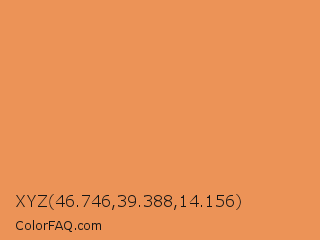 XYZ 46.746,39.388,14.156 Color is a light orange color and the nearest color is Big Foot Feet #e88e5a. Hex code #ec9357 and RGB value is rgb(236,147,87). In RGB color space, this color is composed of 93% red, 58% green, 34% blue, In CMYK color space, this color is composed of 0% cyan, 38% magenta, 63% yellow , 7% black , In HSL color space, this color has a hue angle of 24° , 80% saturation and 63% lightness.