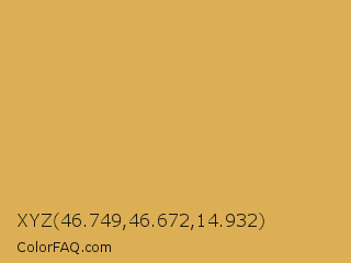 XYZ 46.749,46.672,14.932 Color is a normal orange color and the nearest color is Sunray #e3ab57. Hex code #ddaf54 and RGB value is rgb(221,175,84). In RGB color space, this color is composed of 87% red, 69% green, 33% blue, In CMYK color space, this color is composed of 0% cyan, 21% magenta, 62% yellow , 13% black , In HSL color space, this color has a hue angle of 40° , 67% saturation and 60% lightness.