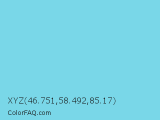 XYZ 46.751,58.492,85.17 Color is a light cyan color and the nearest color is Sky Blue #76d7ea. Hex code #79d7e8 and RGB value is rgb(121,215,232). In RGB color space, this color is composed of 47% red, 84% green, 91% blue, In CMYK color space, this color is composed of 48% cyan, 7% magenta, 0% yellow , 9% black , In HSL color space, this color has a hue angle of 189° , 71% saturation and 69% lightness.