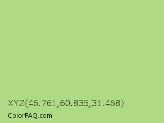 XYZ 46.761,60.835,31.468 Color is a light green color and the nearest color is Feijoa #9fdd8c. Hex code #aeda85 and RGB value is rgb(174,218,133). In RGB color space, this color is composed of 68% red, 85% green, 52% blue, In CMYK color space, this color is composed of 20% cyan, 0% magenta, 39% yellow , 15% black , In HSL color space, this color has a hue angle of 91° , 53% saturation and 69% lightness.