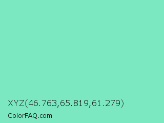 XYZ 46.763,65.819,61.279 Color is a light green color and the nearest color is Bermuda #7dd8c6. Hex code #7be8c2 and RGB value is rgb(123,232,194). In RGB color space, this color is composed of 48% red, 91% green, 76% blue, In CMYK color space, this color is composed of 47% cyan, 0% magenta, 16% yellow , 9% black , In HSL color space, this color has a hue angle of 159° , 70% saturation and 70% lightness.