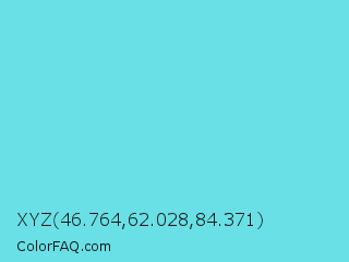 XYZ 46.764,62.028,84.371 Color is a light cyan color and the nearest color is Turquoise Blue #6cdae7. Hex code #69e0e6 and RGB value is rgb(105,224,230). In RGB color space, this color is composed of 41% red, 88% green, 90% blue, In CMYK color space, this color is composed of 54% cyan, 3% magenta, 0% yellow , 10% black , In HSL color space, this color has a hue angle of 183° , 71% saturation and 66% lightness.