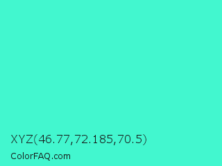 XYZ 46.77,72.185,70.5 Color is a light cyan color and the nearest color is Turquoise #40e0d0. Hex code #42f7cf and RGB value is rgb(66,247,207). In RGB color space, this color is composed of 26% red, 97% green, 81% blue, In CMYK color space, this color is composed of 73% cyan, 0% magenta, 16% yellow , 3% black , In HSL color space, this color has a hue angle of 167° , 92% saturation and 61% lightness.