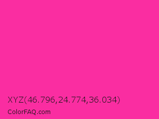 XYZ 46.796,24.774,36.034 Color is a normal magenta color and the nearest color is Persian Rose #fe28a2. Hex code #fa2da1 and RGB value is rgb(250,45,161). In RGB color space, this color is composed of 98% red, 18% green, 63% blue, In CMYK color space, this color is composed of 0% cyan, 82% magenta, 36% yellow , 2% black , In HSL color space, this color has a hue angle of 326° , 95% saturation and 58% lightness.