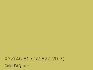 XYZ 46.815,52.827,20.3 Color is a normal yellow color and the nearest color is Tacha #d6c562. Hex code #ccc366 and RGB value is rgb(204,195,102). In RGB color space, this color is composed of 80% red, 76% green, 40% blue, In CMYK color space, this color is composed of 0% cyan, 4% magenta, 50% yellow , 20% black , In HSL color space, this color has a hue angle of 55° , 50% saturation and 60% lightness.