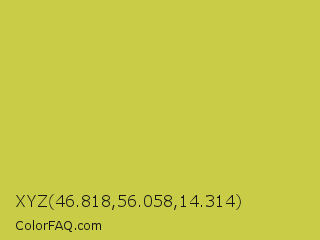 XYZ 46.818,56.058,14.314 Color is a normal yellow color and the nearest color is Turmeric #cabb48. Hex code #c9cc47 and RGB value is rgb(201,204,71). In RGB color space, this color is composed of 79% red, 80% green, 28% blue, In CMYK color space, this color is composed of 1% cyan, 0% magenta, 65% yellow , 20% black , In HSL color space, this color has a hue angle of 61° , 57% saturation and 54% lightness.