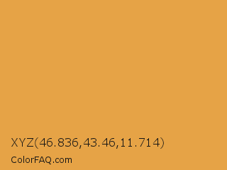 XYZ 46.836,43.46,11.714 Color is a normal orange color and the nearest color is Indian Yellow #e3a857. Hex code #e6a346 and RGB value is rgb(230,163,70). In RGB color space, this color is composed of 90% red, 64% green, 27% blue, In CMYK color space, this color is composed of 0% cyan, 29% magenta, 70% yellow , 10% black , In HSL color space, this color has a hue angle of 35° , 76% saturation and 59% lightness.