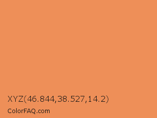 XYZ 46.844,38.527,14.2 Color is a light orange color and the nearest color is Big Foot Feet #e88e5a. Hex code #ee8f58 and RGB value is rgb(238,143,88). In RGB color space, this color is composed of 93% red, 56% green, 35% blue, In CMYK color space, this color is composed of 0% cyan, 40% magenta, 63% yellow , 7% black , In HSL color space, this color has a hue angle of 22° , 82% saturation and 64% lightness.