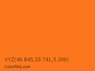 XYZ 46.845,33.741,5.206 Color is a normal orange color and the nearest color is Pumpkin #ff7518. Hex code #fc761d and RGB value is rgb(252,118,29). In RGB color space, this color is composed of 99% red, 46% green, 11% blue, In CMYK color space, this color is composed of 0% cyan, 53% magenta, 88% yellow , 1% black , In HSL color space, this color has a hue angle of 24° , 97% saturation and 55% lightness.