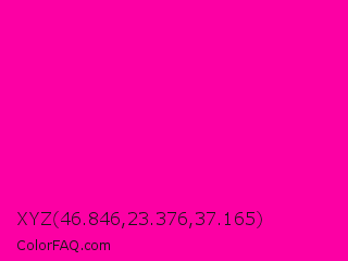 XYZ 46.846,23.376,37.165 Color is a normal magenta color and the nearest color is Hollywood Cerise #f400a1. Hex code #fc00a4 and RGB value is rgb(252,0,164). In RGB color space, this color is composed of 99% red, 0% green, 64% blue, In CMYK color space, this color is composed of 0% cyan, 100% magenta, 35% yellow , 1% black , In HSL color space, this color has a hue angle of 321° , 100% saturation and 49% lightness.