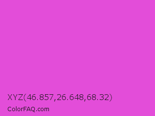 XYZ 46.857,26.648,68.32 Color is a normal magenta color and the nearest color is Purple Pizzazz #fe4eda. Hex code #e34dd9 and RGB value is rgb(227,77,217). In RGB color space, this color is composed of 89% red, 30% green, 85% blue, In CMYK color space, this color is composed of 0% cyan, 66% magenta, 4% yellow , 11% black , In HSL color space, this color has a hue angle of 304° , 73% saturation and 60% lightness.