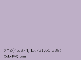 XYZ 46.874,45.731,60.389 Color is a light purple color and the nearest color is Chatelle #bdb3c7. Hex code #beafc7 and RGB value is rgb(190,175,199). In RGB color space, this color is composed of 75% red, 69% green, 78% blue, In CMYK color space, this color is composed of 5% cyan, 12% magenta, 0% yellow , 22% black , In HSL color space, this color has a hue angle of 278° , 18% saturation and 73% lightness.