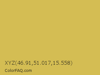 XYZ 46.91,51.017,15.558 Color is a normal yellow color and the nearest color is Turmeric #cabb48. Hex code #d4bd53 and RGB value is rgb(212,189,83). In RGB color space, this color is composed of 83% red, 74% green, 33% blue, In CMYK color space, this color is composed of 0% cyan, 11% magenta, 61% yellow , 17% black , In HSL color space, this color has a hue angle of 49° , 60% saturation and 58% lightness.