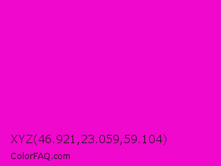 XYZ 46.921,23.059,59.104 Color is a normal magenta color and the nearest color is Purple Pizzazz #ff00cc. Hex code #f008cc and RGB value is rgb(240,8,204). In RGB color space, this color is composed of 94% red, 3% green, 80% blue, In CMYK color space, this color is composed of 0% cyan, 97% magenta, 15% yellow , 6% black , In HSL color space, this color has a hue angle of 309° , 94% saturation and 49% lightness.