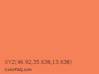 XYZ 46.92,35.638,13.638 Color is a light orange color and the nearest color is Coral #ff7f50. Hex code #f48158 and RGB value is rgb(244,129,88). In RGB color space, this color is composed of 96% red, 51% green, 35% blue, In CMYK color space, this color is composed of 0% cyan, 47% magenta, 64% yellow , 4% black , In HSL color space, this color has a hue angle of 16° , 88% saturation and 65% lightness.