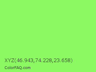 XYZ 46.943,74.228,23.658 Color is a light green color and the nearest color is Screamin Green #66ff66. Hex code #8cf963 and RGB value is rgb(140,249,99). In RGB color space, this color is composed of 55% red, 98% green, 39% blue, In CMYK color space, this color is composed of 44% cyan, 0% magenta, 60% yellow , 2% black , In HSL color space, this color has a hue angle of 104° , 93% saturation and 68% lightness.