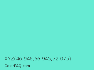XYZ 46.946,66.945,72.075 Color is a light cyan color and the nearest color is Aquamarine Blue #71d9e2. Hex code #66ebd3 and RGB value is rgb(102,235,211). In RGB color space, this color is composed of 40% red, 92% green, 83% blue, In CMYK color space, this color is composed of 57% cyan, 0% magenta, 10% yellow , 8% black , In HSL color space, this color has a hue angle of 169° , 77% saturation and 66% lightness.