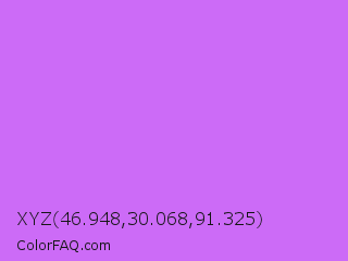 XYZ 46.948,30.068,91.325 Color is a light purple color and the nearest color is Heliotrope #df73ff. Hex code #cc6bf7 and RGB value is rgb(204,107,247). In RGB color space, this color is composed of 80% red, 42% green, 97% blue, In CMYK color space, this color is composed of 17% cyan, 57% magenta, 0% yellow , 3% black , In HSL color space, this color has a hue angle of 282° , 90% saturation and 69% lightness.
