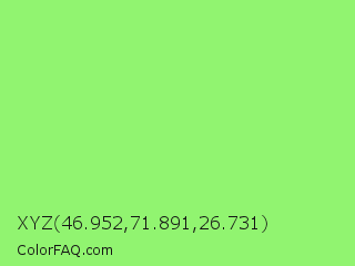 XYZ 46.952,71.891,26.731 Color is a light green color and the nearest color is Light Green #90ee90. Hex code #91f470 and RGB value is rgb(145,244,112). In RGB color space, this color is composed of 57% red, 96% green, 44% blue, In CMYK color space, this color is composed of 41% cyan, 0% magenta, 54% yellow , 4% black , In HSL color space, this color has a hue angle of 105° , 86% saturation and 70% lightness.