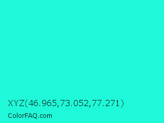 XYZ 46.965,73.052,77.271 Color is a normal cyan color and the nearest color is Bright Turquoise #08e8de. Hex code #1ff9d9 and RGB value is rgb(31,249,217). In RGB color space, this color is composed of 12% red, 98% green, 85% blue, In CMYK color space, this color is composed of 88% cyan, 0% magenta, 13% yellow , 2% black , In HSL color space, this color has a hue angle of 171° , 95% saturation and 55% lightness.
