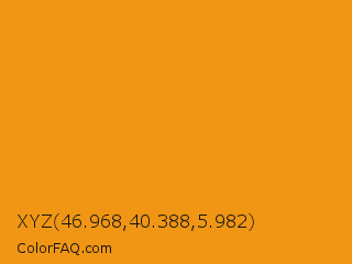 XYZ 46.968,40.388,5.982 Color is a normal orange color and the nearest color is Gamboge #e49b0f. Hex code #f09614 and RGB value is rgb(240,150,20). In RGB color space, this color is composed of 94% red, 59% green, 8% blue, In CMYK color space, this color is composed of 0% cyan, 38% magenta, 92% yellow , 6% black , In HSL color space, this color has a hue angle of 35° , 88% saturation and 51% lightness.
