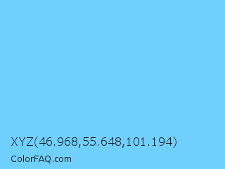 XYZ 46.968,55.648,101.194 Color is a light blue color and the nearest color is Maya Blue #73c2fb. Hex code #70d0fd and RGB value is rgb(112,208,253). In RGB color space, this color is composed of 44% red, 82% green, 99% blue, In CMYK color space, this color is composed of 56% cyan, 18% magenta, 0% yellow , 1% black , In HSL color space, this color has a hue angle of 199° , 97% saturation and 72% lightness.
