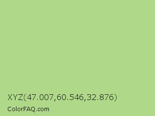 XYZ 47.007,60.546,32.876 Color is a light green color and the nearest color is Feijoa #9fdd8c. Hex code #afd989 and RGB value is rgb(175,217,137). In RGB color space, this color is composed of 69% red, 85% green, 54% blue, In CMYK color space, this color is composed of 19% cyan, 0% magenta, 37% yellow , 15% black , In HSL color space, this color has a hue angle of 92° , 51% saturation and 69% lightness.