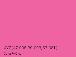 XYZ 47.008,30.093,37.981 Color is a light rose color and the nearest color is Cyclamen #f56fa1. Hex code #f063a3 and RGB value is rgb(240,99,163). In RGB color space, this color is composed of 94% red, 39% green, 64% blue, In CMYK color space, this color is composed of 0% cyan, 59% magenta, 32% yellow , 6% black , In HSL color space, this color has a hue angle of 333° , 82% saturation and 66% lightness.