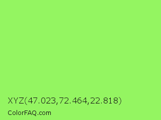 XYZ 47.023,72.464,22.818 Color is a light green color and the nearest color is Inchworm #b2ec5d. Hex code #94f561 and RGB value is rgb(148,245,97). In RGB color space, this color is composed of 58% red, 96% green, 38% blue, In CMYK color space, this color is composed of 40% cyan, 0% magenta, 60% yellow , 4% black , In HSL color space, this color has a hue angle of 99° , 88% saturation and 67% lightness.