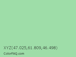 XYZ 47.025,61.809,46.498 Color is a light green color and the nearest color is Turquoise Green #a0d6b4. Hex code #9edda8 and RGB value is rgb(158,221,168). In RGB color space, this color is composed of 62% red, 87% green, 66% blue, In CMYK color space, this color is composed of 29% cyan, 0% magenta, 24% yellow , 13% black , In HSL color space, this color has a hue angle of 130° , 48% saturation and 74% lightness.