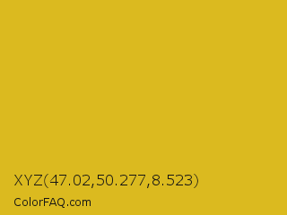 XYZ 47.02,50.277,8.523 Color is a normal yellow color and the nearest color is Gold Tips #deba13. Hex code #dbba1f and RGB value is rgb(219,186,31). In RGB color space, this color is composed of 86% red, 73% green, 12% blue, In CMYK color space, this color is composed of 0% cyan, 15% magenta, 86% yellow , 14% black , In HSL color space, this color has a hue angle of 49° , 75% saturation and 49% lightness.