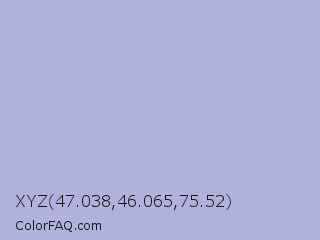 XYZ 47.038,46.065,75.52 Color is a light blue color and the nearest color is Maximum Blue Purple #acace6. Hex code #b1b1de and RGB value is rgb(177,177,222). In RGB color space, this color is composed of 69% red, 69% green, 87% blue, In CMYK color space, this color is composed of 20% cyan, 20% magenta, 0% yellow , 13% black , In HSL color space, this color has a hue angle of 240° , 41% saturation and 78% lightness.