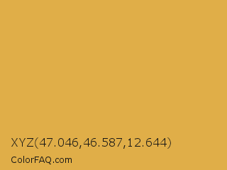 XYZ 47.046,46.587,12.644 Color is a normal orange color and the nearest color is Anzac #e0b646. Hex code #e0ae48 and RGB value is rgb(224,174,72). In RGB color space, this color is composed of 88% red, 68% green, 28% blue, In CMYK color space, this color is composed of 0% cyan, 22% magenta, 68% yellow , 12% black , In HSL color space, this color has a hue angle of 40° , 71% saturation and 58% lightness.