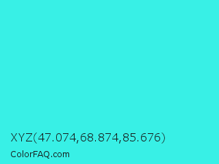 XYZ 47.074,68.874,85.676 Color is a normal cyan color and the nearest color is Turquoise #40e0d0. Hex code #38f0e6 and RGB value is rgb(56,240,230). In RGB color space, this color is composed of 22% red, 94% green, 90% blue, In CMYK color space, this color is composed of 77% cyan, 0% magenta, 4% yellow , 6% black , In HSL color space, this color has a hue angle of 177° , 86% saturation and 58% lightness.