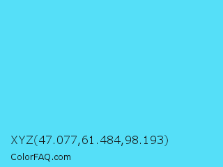 XYZ 47.077,61.484,98.193 Color is a light cyan color and the nearest color is Turquoise Blue #6cdae7. Hex code #55dff8 and RGB value is rgb(85,223,248). In RGB color space, this color is composed of 33% red, 87% green, 97% blue, In CMYK color space, this color is composed of 66% cyan, 10% magenta, 0% yellow , 3% black , In HSL color space, this color has a hue angle of 189° , 92% saturation and 65% lightness.