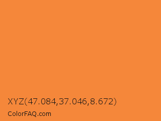 XYZ 47.084,37.046,8.672 Color is a normal orange color and the nearest color is Jaffa #ef863f. Hex code #f5873a and RGB value is rgb(245,135,58). In RGB color space, this color is composed of 96% red, 53% green, 23% blue, In CMYK color space, this color is composed of 0% cyan, 45% magenta, 76% yellow , 4% black , In HSL color space, this color has a hue angle of 25° , 90% saturation and 59% lightness.
