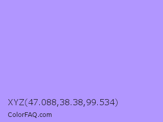 XYZ 47.088,38.38,99.534 Color is a light indigo color and the nearest color is Biloba Flower #b2a1ea. Hex code #b196ff and RGB value is rgb(177,150,255). In RGB color space, this color is composed of 69% red, 59% green, 100% blue, In CMYK color space, this color is composed of 31% cyan, 41% magenta, 0% yellow , 0% black , In HSL color space, this color has a hue angle of 255° , 100% saturation and 79% lightness.