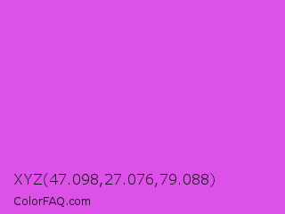 XYZ 47.098,27.076,79.088 Color is a light magenta color and the nearest color is Orchid #da70d6. Hex code #dc52e8 and RGB value is rgb(220,82,232). In RGB color space, this color is composed of 86% red, 32% green, 91% blue, In CMYK color space, this color is composed of 5% cyan, 65% magenta, 0% yellow , 9% black , In HSL color space, this color has a hue angle of 295° , 77% saturation and 62% lightness.