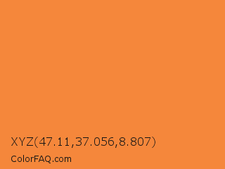 XYZ 47.11,37.056,8.807 Color is a normal orange color and the nearest color is Jaffa #ef863f. Hex code #f5873b and RGB value is rgb(245,135,59). In RGB color space, this color is composed of 96% red, 53% green, 23% blue, In CMYK color space, this color is composed of 0% cyan, 45% magenta, 76% yellow , 4% black , In HSL color space, this color has a hue angle of 25° , 90% saturation and 60% lightness.