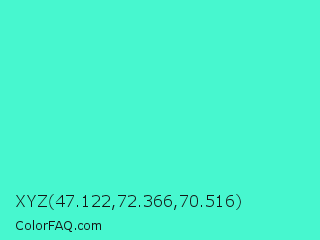 XYZ 47.122,72.366,70.516 Color is a light cyan color and the nearest color is Turquoise #40e0d0. Hex code #47f7cf and RGB value is rgb(71,247,207). In RGB color space, this color is composed of 28% red, 97% green, 81% blue, In CMYK color space, this color is composed of 71% cyan, 0% magenta, 16% yellow , 3% black , In HSL color space, this color has a hue angle of 166° , 92% saturation and 62% lightness.