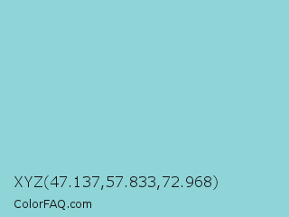 XYZ 47.137,57.833,72.968 Color is a light cyan color and the nearest color is Middle Blue Green #8dd9cc. Hex code #8fd4d7 and RGB value is rgb(143,212,215). In RGB color space, this color is composed of 56% red, 83% green, 84% blue, In CMYK color space, this color is composed of 33% cyan, 1% magenta, 0% yellow , 16% black , In HSL color space, this color has a hue angle of 183° , 47% saturation and 70% lightness.