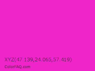 XYZ 47.139,24.065,57.419 Color is a normal magenta color and the nearest color is Hot Magenta #ff1dce. Hex code #f025c9 and RGB value is rgb(240,37,201). In RGB color space, this color is composed of 94% red, 15% green, 79% blue, In CMYK color space, this color is composed of 0% cyan, 85% magenta, 16% yellow , 6% black , In HSL color space, this color has a hue angle of 312° , 87% saturation and 54% lightness.