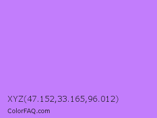 XYZ 47.152,33.165,96.012 Color is a light purple color and the nearest color is Pale Violet #cc99ff. Hex code #c27dfc and RGB value is rgb(194,125,252). In RGB color space, this color is composed of 76% red, 49% green, 99% blue, In CMYK color space, this color is composed of 23% cyan, 50% magenta, 0% yellow , 1% black , In HSL color space, this color has a hue angle of 273° , 95% saturation and 74% lightness.